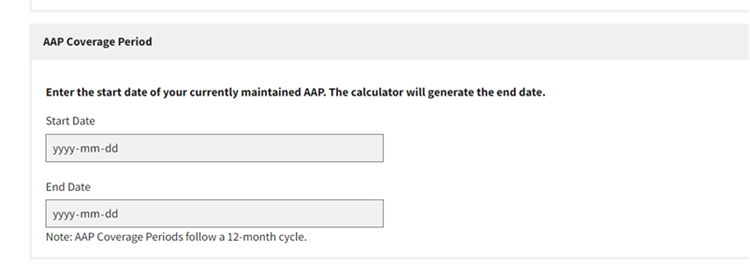 - Contractors are required to enter the start date of the “currently maintained AAP.” When filling in this date, you will use the date as found on the cover page of your written AAP. For example, if you have a July 1, 2023 AAP in place, the start date will be 2023-07-01 and the site will automatically calculate an end date of 2024-07-01. A January 1 plan date will be entered as 2024-01-01. See the chart below to confirm your Certification Deadline and AAP Start Date.
